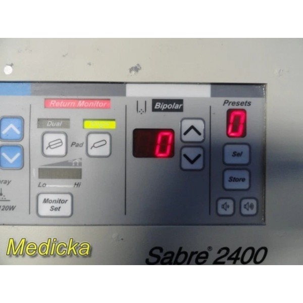 ConMed Sabre 2400 electrosurgical generator designed for monopolar and bipolar surgical procedures. The unit powers on and passes internal self-test with bright LED displays and responsive controls. Bipolar activation functions properly during testing; however monopolar activation lights do not illuminate during footswitch activation. Due to this inconsistency the unit is being offered as-is for parts or repair.