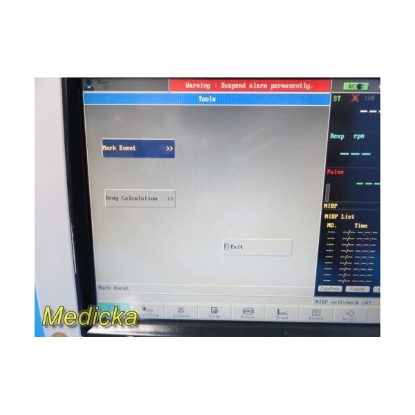 -Comes standard with: ECG, NIBP, SpO2, Temp, Resp, Arrhythmia, ST, OxyCrg, & Drug Dose Calculation