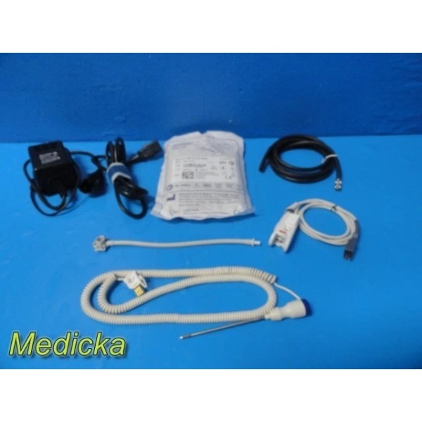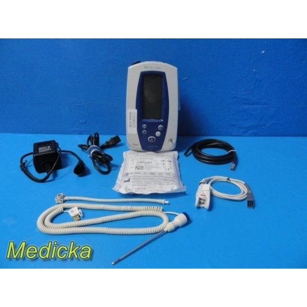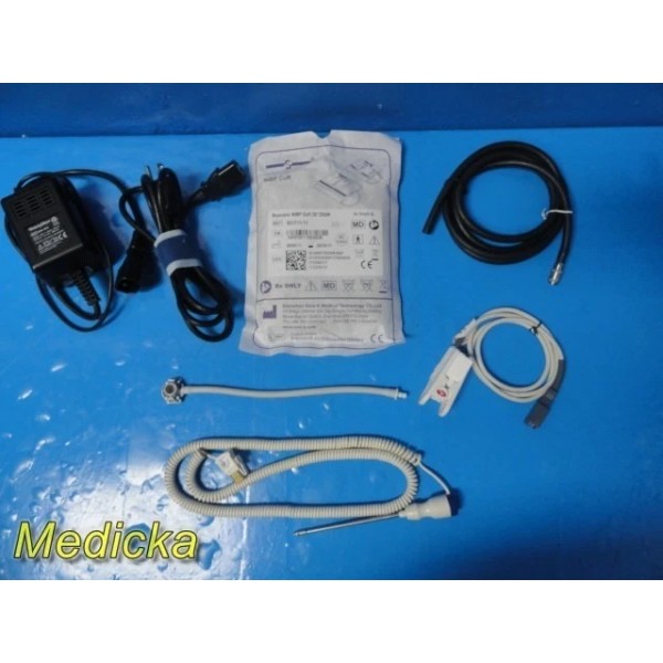 Pre-owned vital signs monitor supporting Temperature, SpO₂ (Masimo), and NIBP. Unit powers on with no errors; LCD shows minor fading. Includes installed battery (condition unknown), SpO₂ sensor, NIBP hose, temperature probe, NEW NIBP cuff (SC1711-11), extra adapter, power adapter (5200-101A), and power cord. No manual, stand, or extra leads included. Shows light wear with scuffs but no dents or cracks.