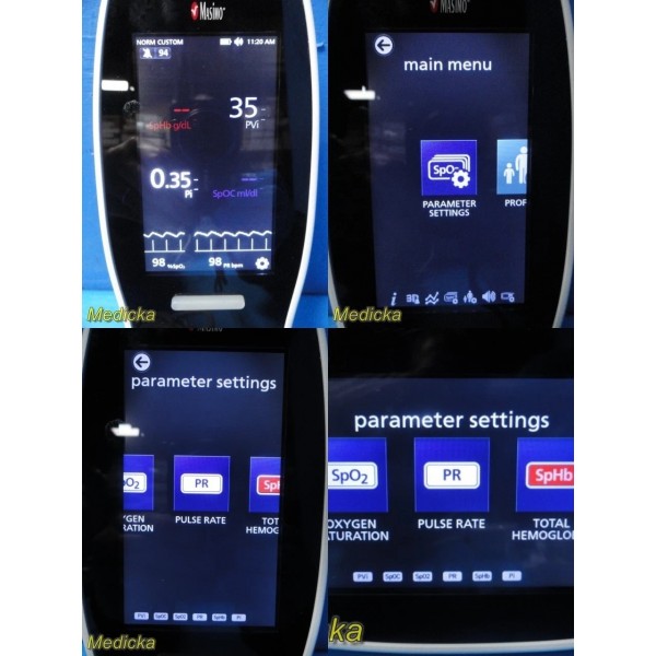Configuration: Handheld unit with Masimo SET® technology; parameters enabled include SpO₂, PR, SpHb, PVi, Pi, and SpOC