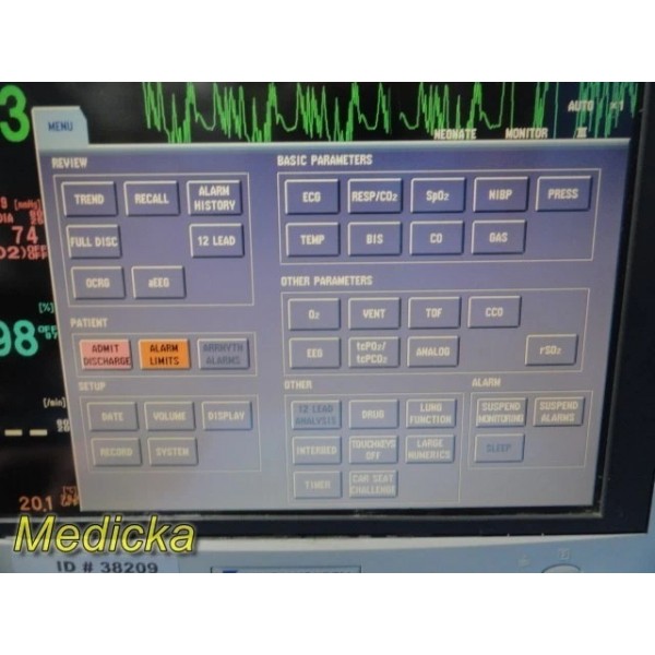 - Basic Parameters (A): ECG, RESP/CO₂, SpO₂, NIBP, PRESS, TEMP, BIS, CO, GAS