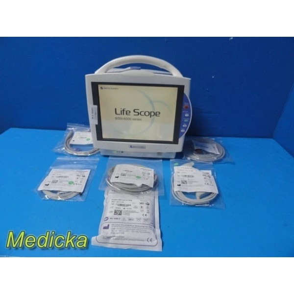 This listing features a Nihon Kohden Life Scope BSM-6501A Multi-Parameter Patient Monitor complete with the AY-653P parameter module. This BIS-ready system supports advanced Masimo SET SpO₂ monitoring and multiple physiological parameters, offering reliable patient monitoring for clinical and hospital environments. The system includes a full-color touchscreen display, bright and responsive LCD, and a modular design for versatile use.