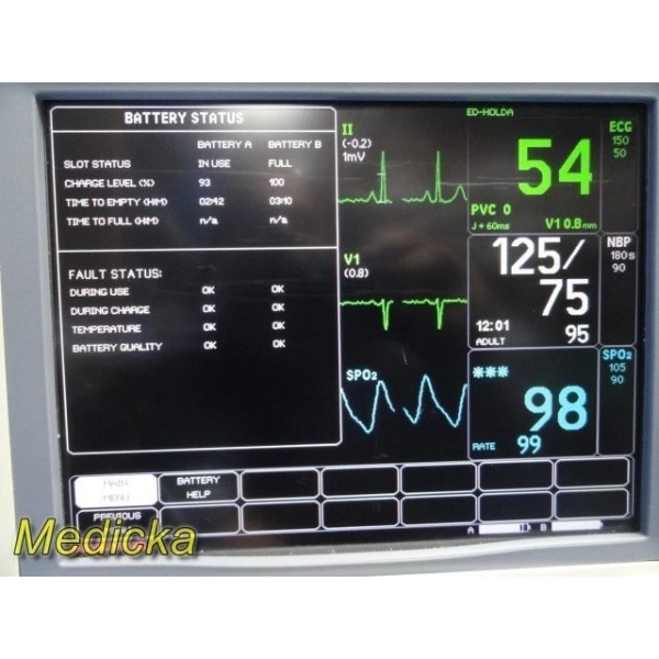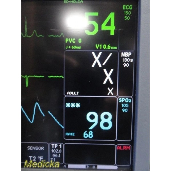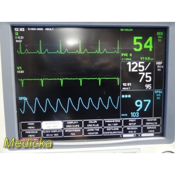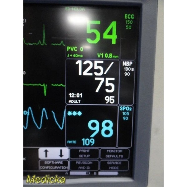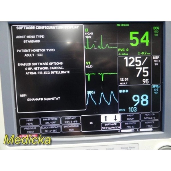 This unit supports ECG, SpO₂, NIBP (DINAMAP SuperSTAT), and temperature monitoring with software-enabled cardiac analysis features.
