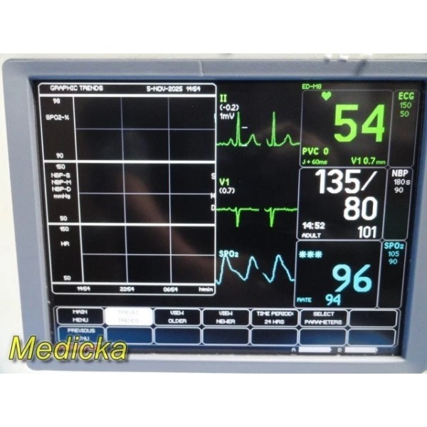 This unit powers on, passes internal self-tests, and displays clear ECG and SpO₂ waveforms with accurate NIBP measurements.