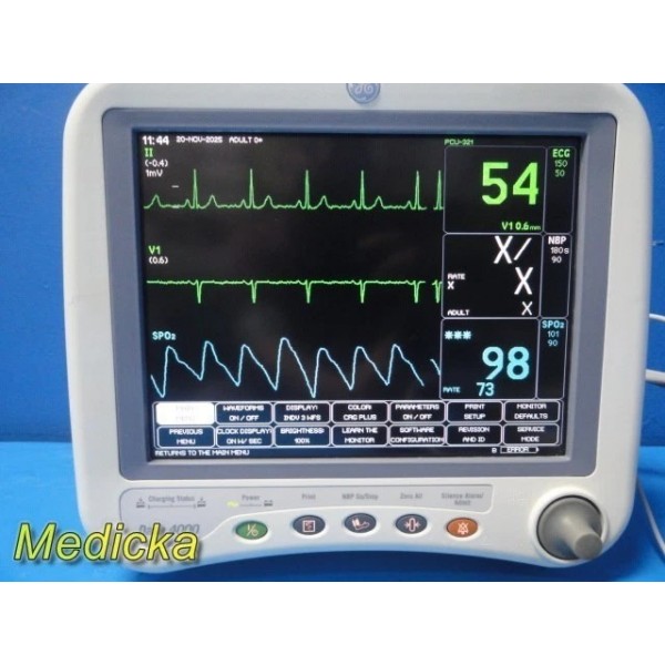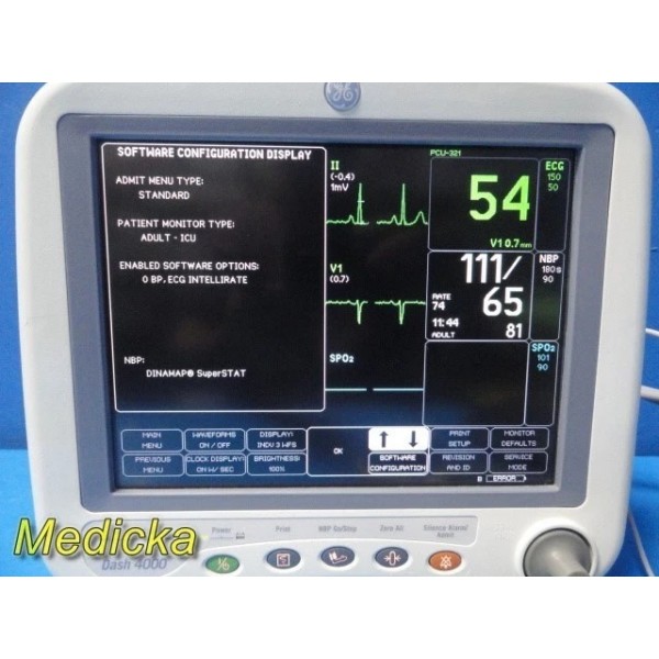 The GE Dash 4000 is a compact, durable, high-acuity patient monitor designed for ICU, ER, OR, and transport use. This unit has been powered on, tested, and all installed parameters are working (ECG, SpO₂, NIBP, Temperature, RR). The display is bright, the trim knob is responsive, and the printer mechanism is functional. Although this unit has hardware for 2× IBP, the software license is not activated, so IBP will not appear as a selectable parameter.