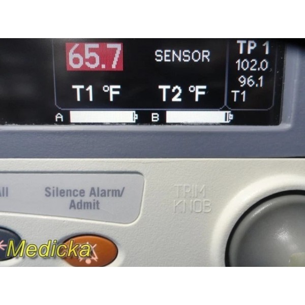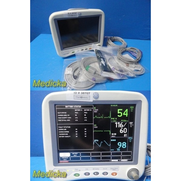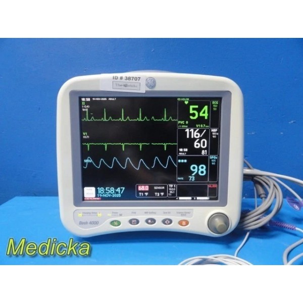 The GE Dash 4000 is a high-acuity, transport-ready patient monitor designed for ICU, OR, ED, and step-down environments. This unit powers on normally, passes internal diagnostics, and all installed parameters—ECG, NIBP, SpO₂, Respiration, and Temperature (TP1)—are active and responsive. The printer module is not installed. Two GE lithium-ion batteries are installed and fully charged at the time of testing. Buyer is advised to charge the batteries overnight before clinical use; no warranty is provided on used batteries.