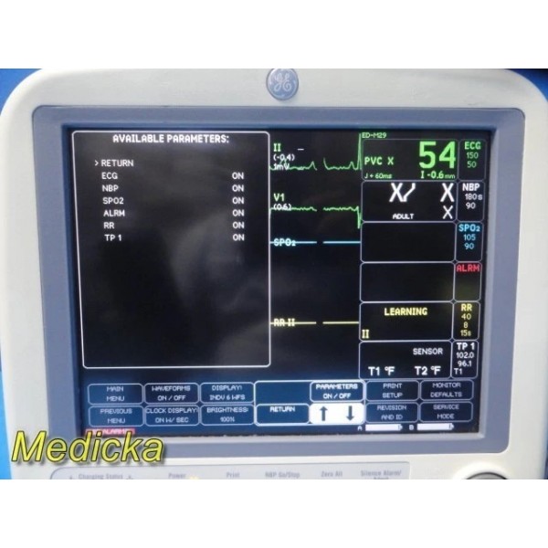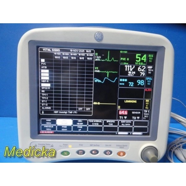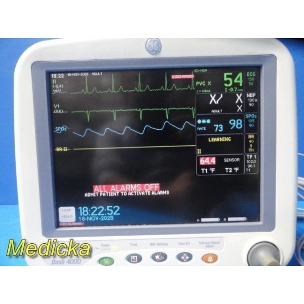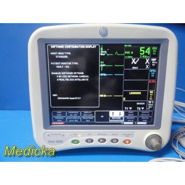 Item: | GE Dash 4000 Monitor (CO2, T/CO, SpO2, ECG, NBP) W/ 2x Batteries & NEW Leads |