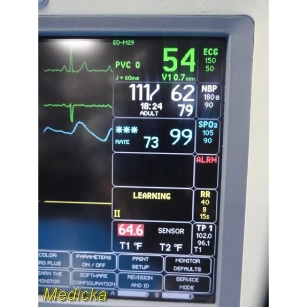 - Enabled Software Options: CO₂, NIBP, Network, Cardiac, Atrial Fibrillation, ECG IntelliRate