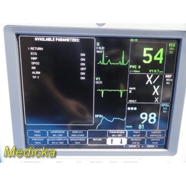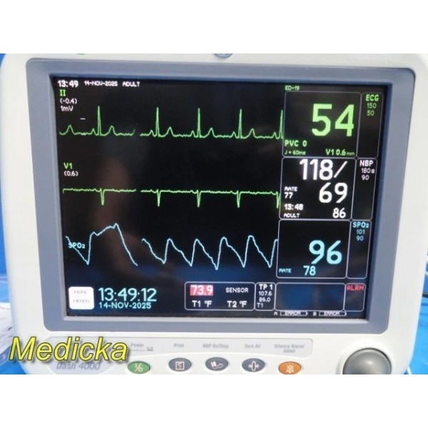 The GE Dash 4000 is a dependable, transport-ready multi-parameter patient monitor designed for high-acuity environments including ICU, ED, OR, and step-down. This tested unit supports ECG, NIBP, Masimo SET® SpO₂, Respiration (RR), and TP1 Temperature. The display is bright and clear, all soft keys respond, and all installed parameters operate correctly.