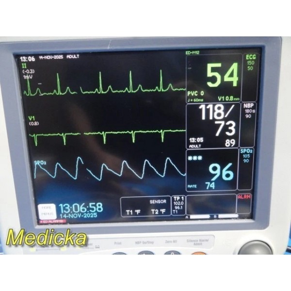 The GE Dash 4000 is a compact, high-acuity, multi-parameter patient monitor designed for ICU, step-down, and transport use. This tested unit supports ECG, NIBP, SpO₂ (Nellcor OxiMax®), Temperature (TP1), and Respiration functions with reliable performance and accurate readings. The CO₂ hardware is installed, though the software feature is not enabled in this configuration. The display is bright and clear.