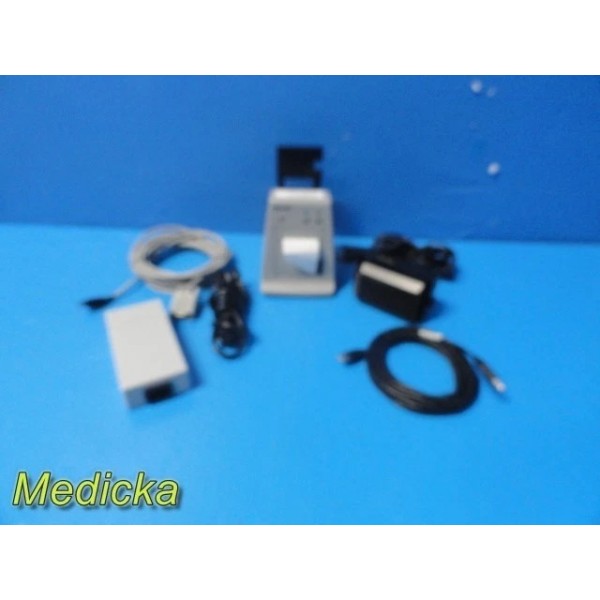 Complete Philips M3176C recorder/printer set. Each unit powers on and includes its matched 2017 AC adapter, UPC 12V output cable, long-lead speaker module, USB printer cable, and mounting hardware. No additional testing performed.