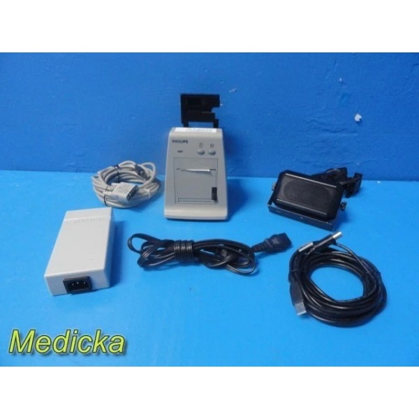 Philips M3176C recorder/printer with DOM 06/2018, paired with its matching AC adapter, UPC 12V output cable, speaker module, USB printer cable, and mounting hardware. Power-tested only.
