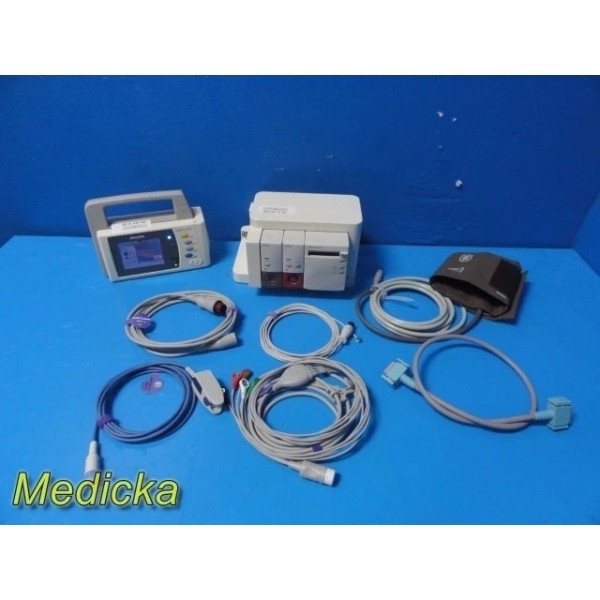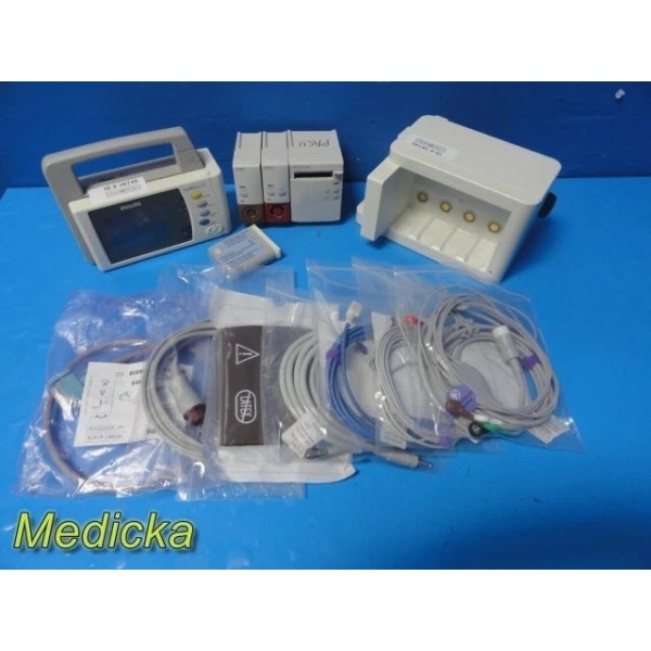 Short description: Complete Philips IntelliVue X2 transport monitoring package paired with the FMS-4 module server and three Philips modules (Temp, IBP, Recorder). Includes a full set of brand-new Sino-K accessories and an OEM Philips interface cable. X2 monitor has bright display, responsive touch, and clean ports. FMS has minor cosmetic chips but is structurally intact. Perfect for portable, transport, or intermediate-care monitoring setups. Philips IntelliVue X2 Monitor: