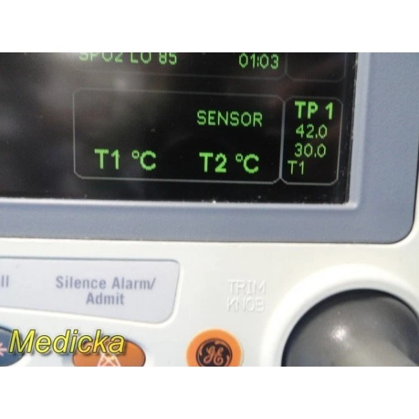 GE Dash 3000/4000/5000 patient monitor (P/N 2035598-203), tested with multiple cables and parameters. Unit powers on, LCD is bright, parameters respond, and all installed hardware appears functional. However, the trim knob is unresponsive, preventing full navigation of the menu system. Because of the trim knob failure and unknown software configuration, the unit is being sold AS-IS / For Parts Use Only.