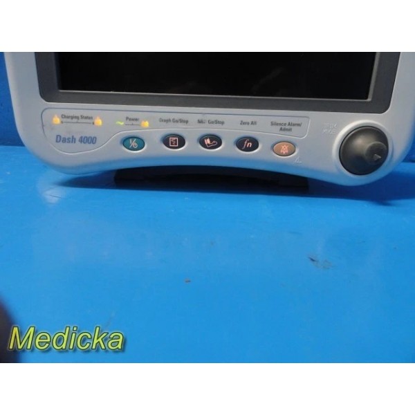 GE Dash 4000 patient monitor with internal printer, dual batteries, and multiple monitoring hardware ports. The unit has been tested with ECG, NIBP, Temperature, and IBP cables and is functioning normally. LCD is bright and clear and soft keys are responsive. The system boots fully and operates as expected. CO₂ hardware is installed but CO₂ software is not active.