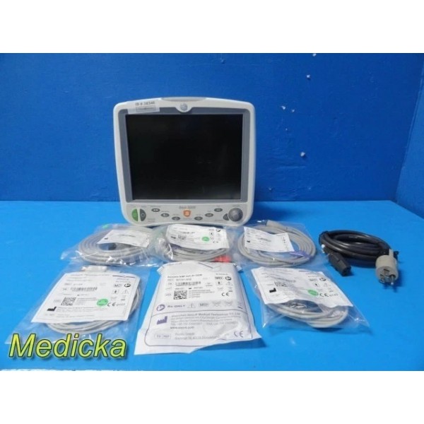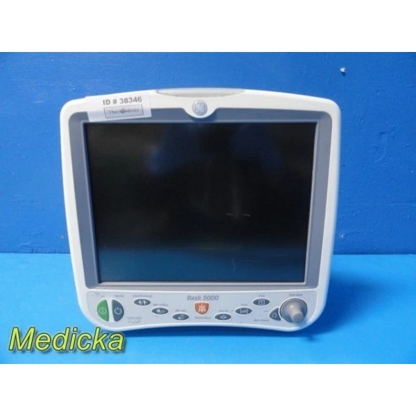 Fully functional GE Dash 5000 Bedside Patient Monitor with Masimo SpO2, ECG, NIBP, 2× IBP, Temperature, and Respiration. Monitor passes self-test, features a bright LCD, responsive keypad, fair cosmetic condition. Includes a complete set of new compatible Non-OEM accessories and an integrated base/stand-mount socket. Unit is stable, responsive, and functioning well.
