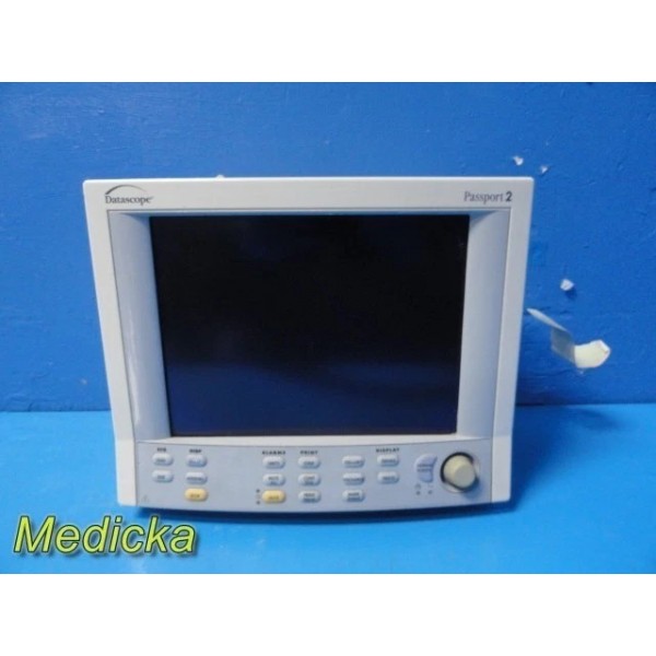 The Datascope Passport 2 is a compact and transport-capable patient monitor designed for reliable vital signs monitoring in clinical and transport settings. This unit has been tested and is operational, featuring a bright monochrome display, responsive controls, and an installed printer. The monitor is configured with essential monitoring parameters and includes key accessories for immediate setup.