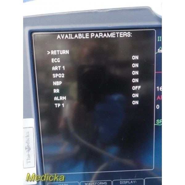 - ECG, SpO₂ (OxiMax), NIBP, IBP, RR, temperature, and CO₂ recognized