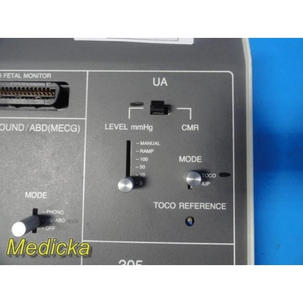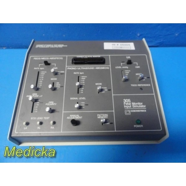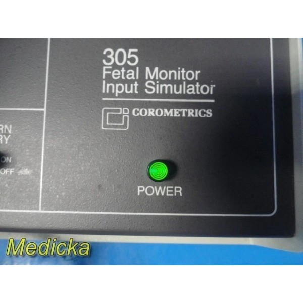 GE Corometrics Model 305 Fetal Monitor Input Simulator, used for testing and simulating fetal monitoring signals including FECG, MECG, ABD, ultrasound, and uterine activity (UA). The unit powers on and appears to function properly. All control knobs, switches, and buttons are intact and responsive. Includes a genuine GE Corometrics interface cable. Offered in very good cosmetic condition.