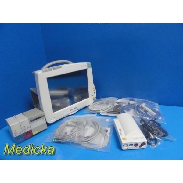 Fully functional Philips IntelliVue MP50 Neonatal / Pediatric Monitoring System with masimo and Nellcor SpO₂ capability, multiparameter module installed, dual side module bay configuration, integrated recorder, NICU-ready clinical profiles, bright touchscreen display, and multiple new CE-marked reusable accessories included.