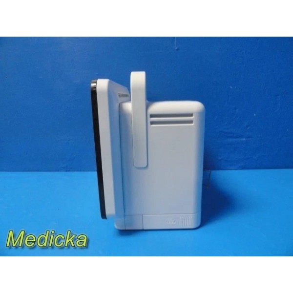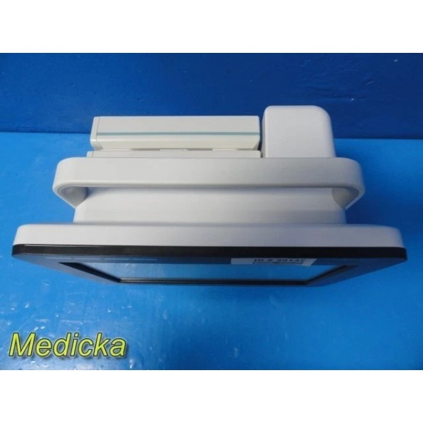 Monitor housing and front bezel are clean with no dents or cracks observed, showing only minor cosmetic wear consistent with normal clinical use. Integrated top handle is intact.