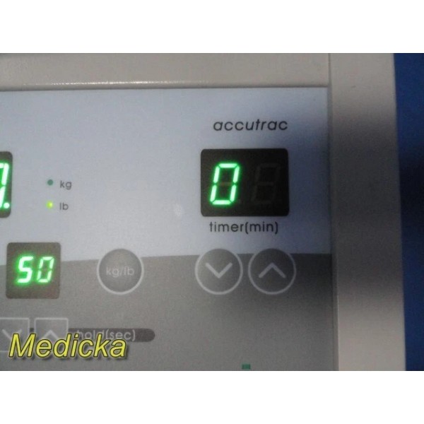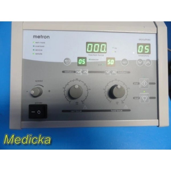 The Metron Accutrac is a traction therapy device designed for clinical use in spinal and cervical traction therapy. It features programmable settings for rest and hold force, pull duration, timer controls, and dual-unit display in both kg and lb. The system ensures reliable and consistent delivery of therapeutic traction. CE# 0197.