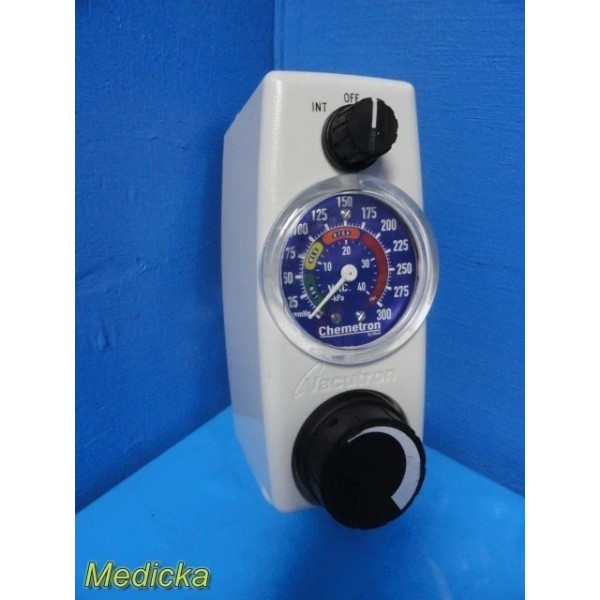 Chemetron intermittent vacuum regulator with a 0–300 mmHg analog gauge featuring color-coded vacuum zones and needle indicator. Includes intact pressure adjustment knob, functional mode selector (Int–Off–Reg), shut-off valve, and safety lock. Wall connector adapter present; hose port has no adapter. Units are untested but in good cosmetic condition with minor wear. (03 units in stock, sold individually).