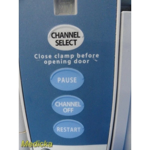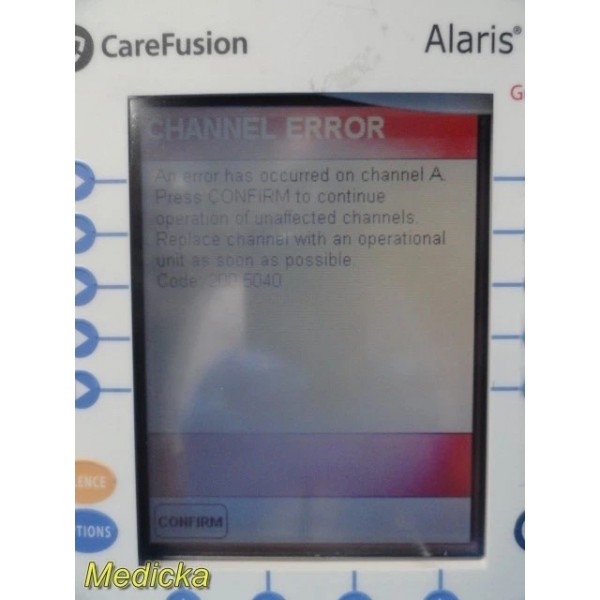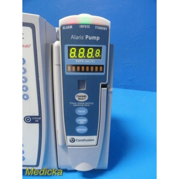 Pre-owned 2013 Alaris Ref 8100 Pump Module Ref 8100DXEN91177. Unit powers on and displays a channel error upon startup when hooked up with the PC unit Visual inspection shows clean casing, intact display, responsive buttons (except channel select), and a smooth door latch mechanism. Sold individually — 10 units available with serials and DOMs listed below. Ideal for parts, repair, or refurbishment use.