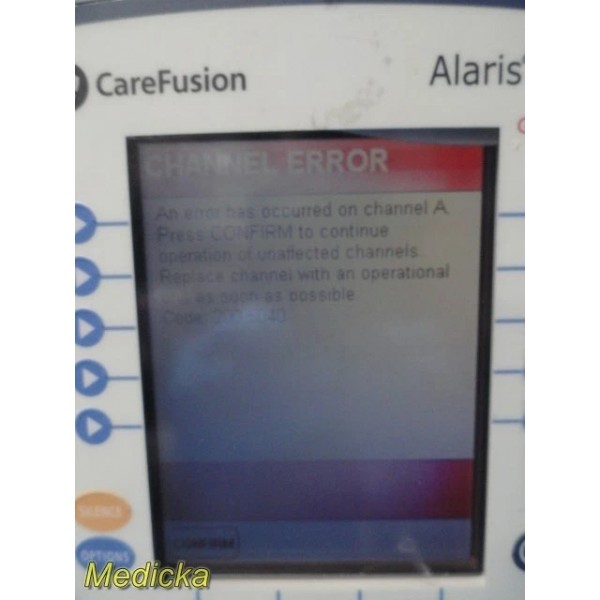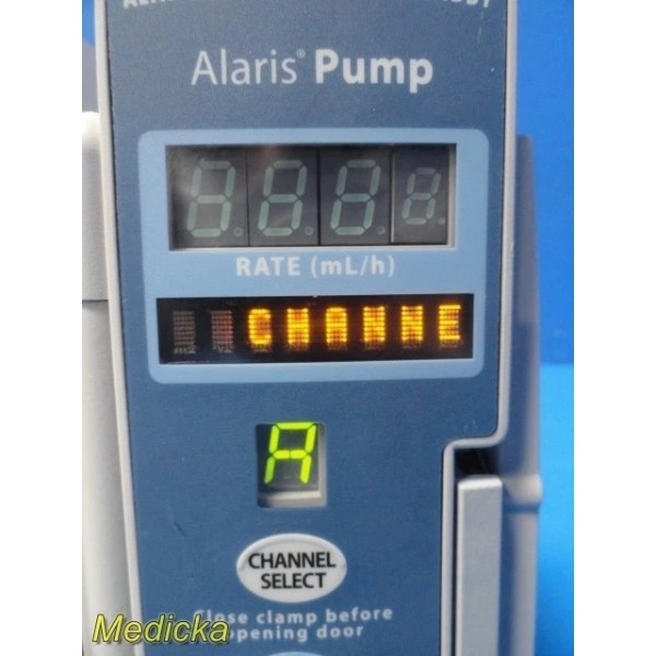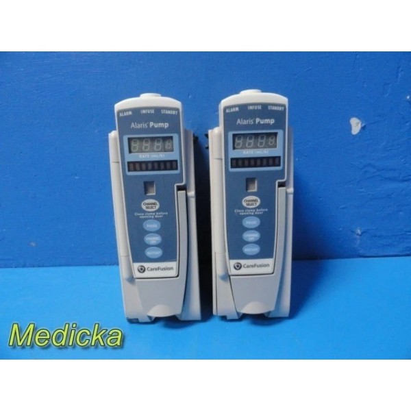 Lot of 2 Alaris 8100 Pump Modules (DOM 2014). Both units power on with active displays, functional indicators, and startup alarms. Controls respond properly, infusion rate values are clear, and latch mechanisms operate smoothly. Rear connection pins are intact, and cosmetic condition is clean with no dents, cracks, or heavy wear. Each module shows CHANNEL ERROR during operation. Includes 2 pump modules only; manuals and accessories not provided.