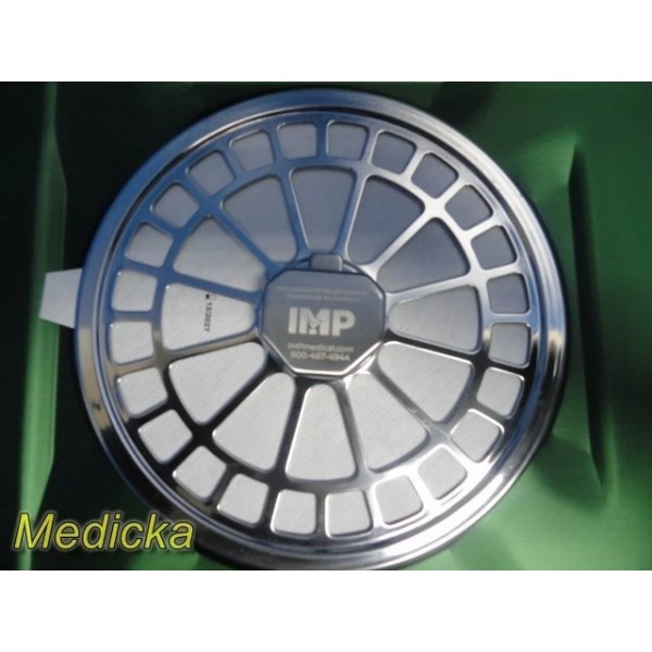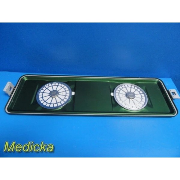 ContainMed / IMP De Mayo Knee Positioner sterilization container set, CAT 923-S, green color code, with solid base and perforated lid, internal basket insert with metallic holders/retainers, and side carry handles. Includes filter retention hardware and paper filters. Unit is in great cosmetic condition.