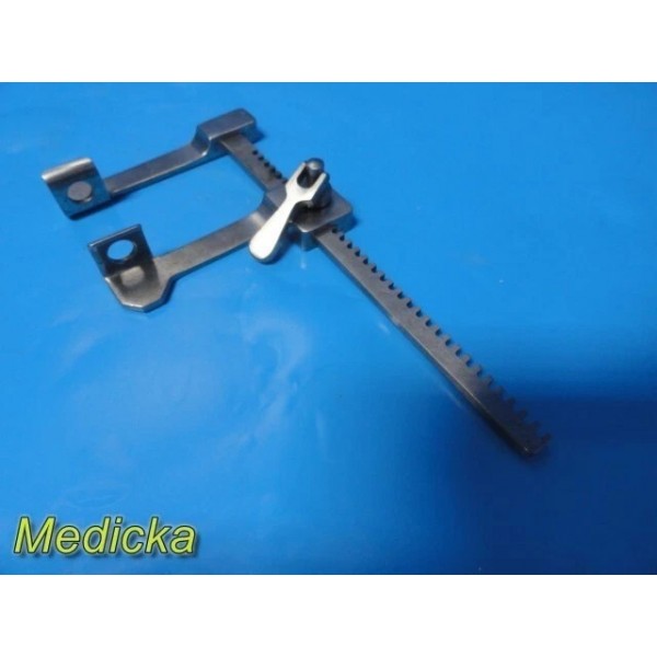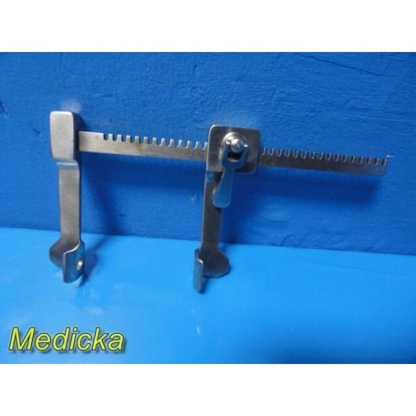 This listing is for a Pediatric CVT Sternal Self-Retaining Retractor manufactured by Weck / Pilling in Germany. Designed for use in cardiothoracic (CVT) procedures, particularly pediatric sternotomies, this compact retractor features a smooth ratcheting mechanism and uniquely shaped blades with round holes. Though the catalog number is unknown, it is built from surgical-grade stainless steel and remains in good operational condition.