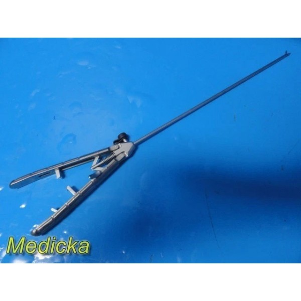 Karl Storz Macro Needle Holder, Model 26173KAF, made in Germany. This 5 mm laparoscopic instrument has a 33 cm working length and is designed for precision suturing with tungsten carbide inserts and single-action straight jaws. Features a disengageable ratchet and axial handle with LUER-lock connector for cleaning.
