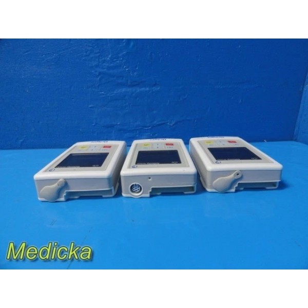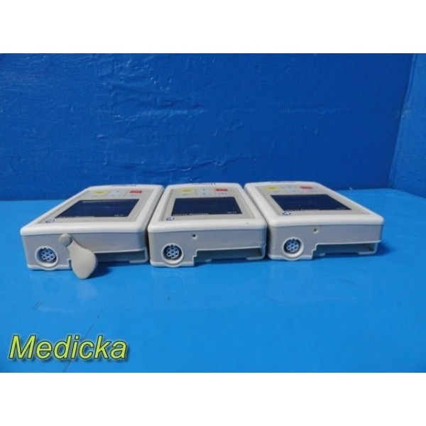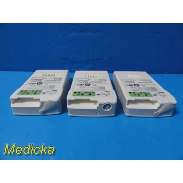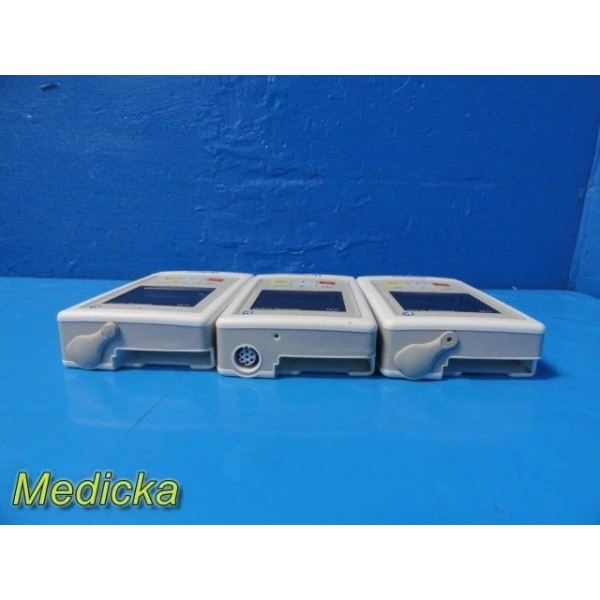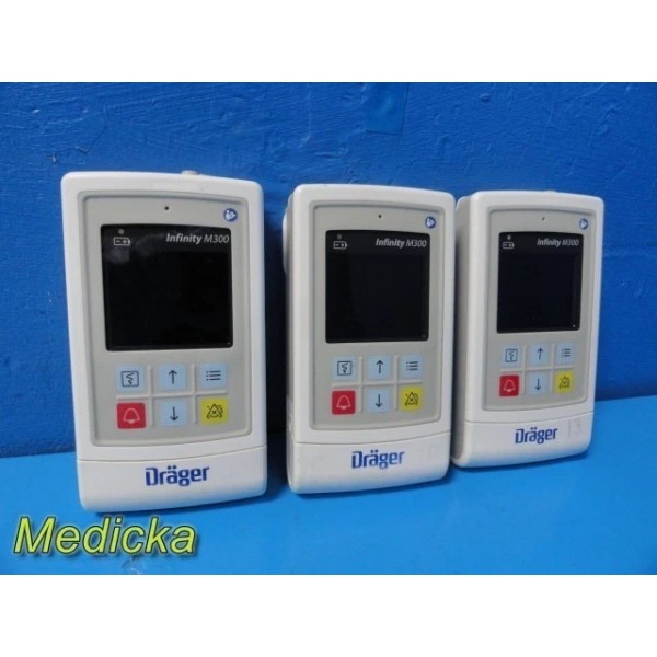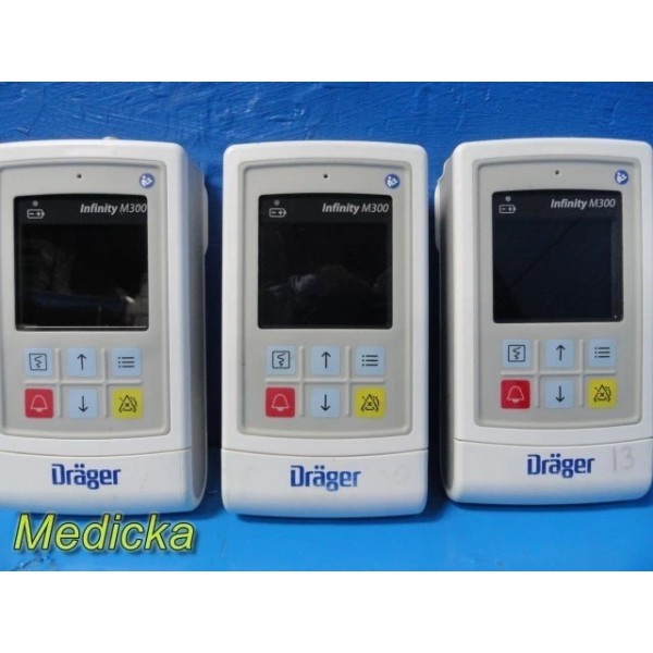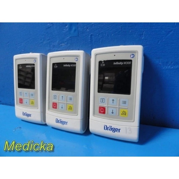 Lot of three Dräger Infinity® M300 telemetry transmitters (REF MS25755-29) designed for patient monitoring of ECG and SpO₂ parameters over secure wireless hospital networks. Each portable unit is lightweight, IPX7-rated, and Wi-Fi enabled, providing reliable telemetry data transmission to Dräger Infinity network monitoring systems.
