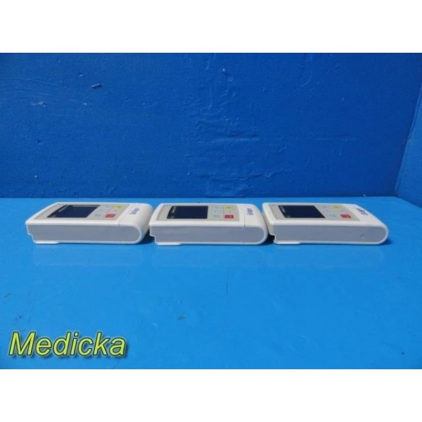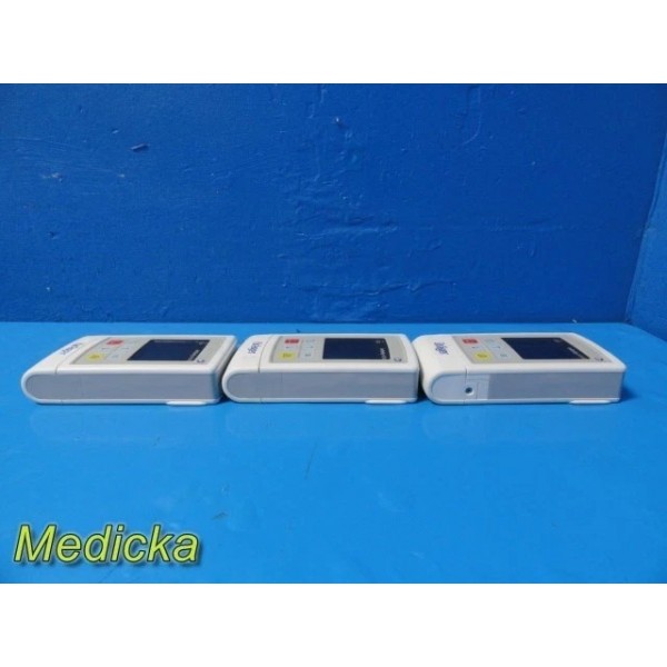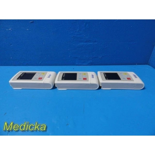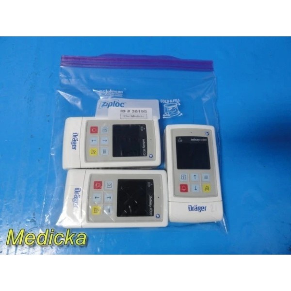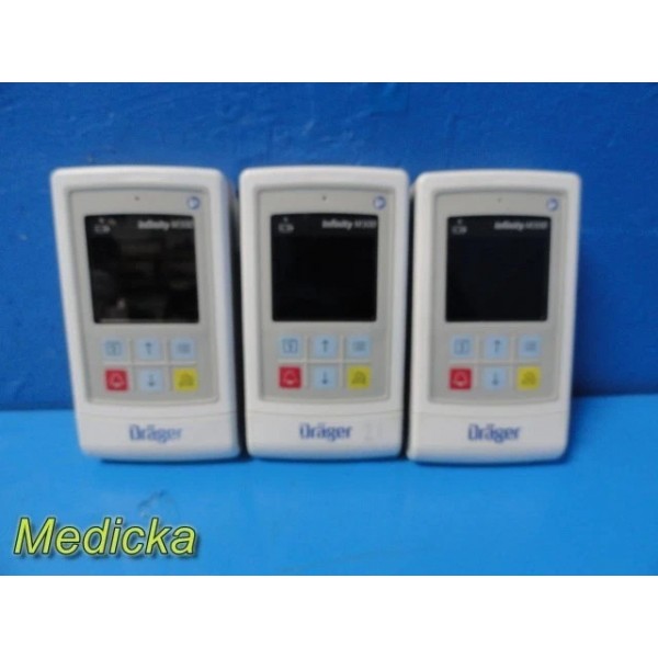 Lot of three Dräger Infinity® M300 telemetry transmitters (REF MS25755). These portable Wi-Fi–enabled patient monitoring devices are designed to measure and transmit real-time SpO₂ and ECG data within Dräger Infinity network systems. All three units are from 2018 production, revision 29–31, and made in the USA.