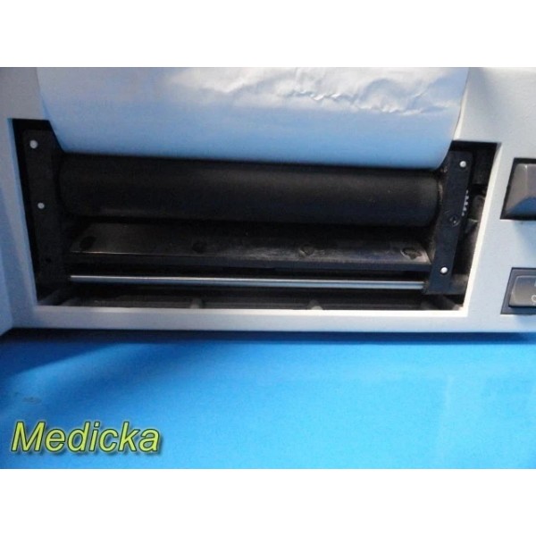 Corometrics 120 Series Maternal/Fetal Monitor with dual ultrasound, TOCO, FECG, maternal NIBP and SpO₂ capability. Unit powers on, passes self-test, recognizes ultrasound and TOCO transducers, and the built-in recorder prints correctly. Please note: the front cosmetic printer cover is missing. Device shows normal signs of prior use and is not patient-ready. No accessories are included except the power cord.